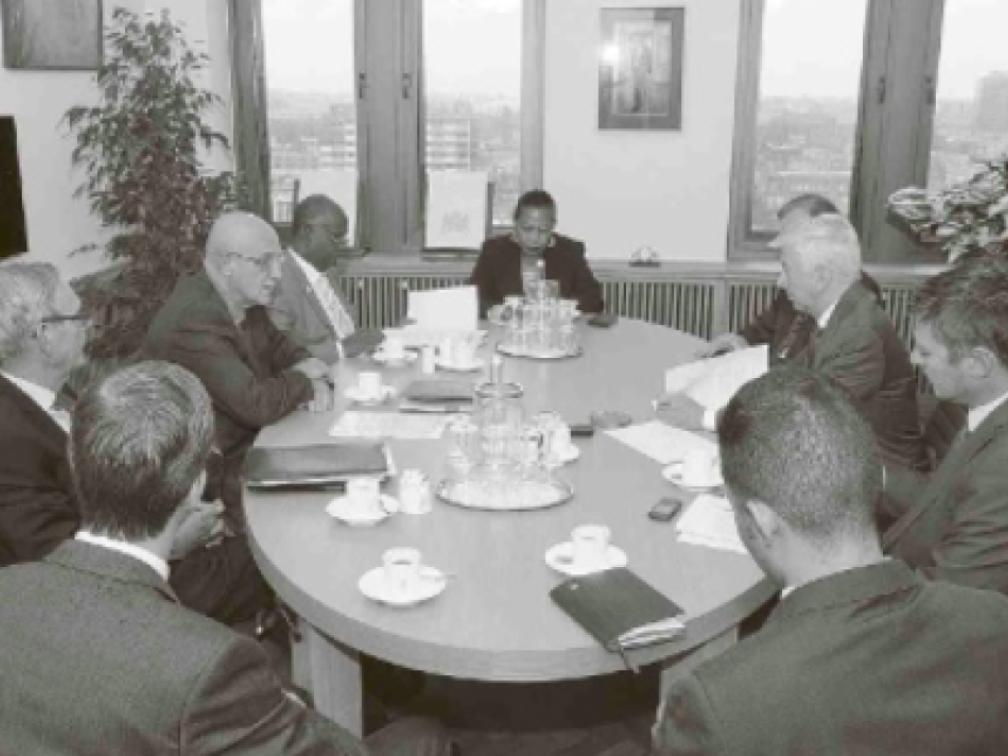 Financiën-minister Martin Hassink (midden, links) met Justitie-minister en vicepremier Dennis Richardson aan zijn linkerzijde en minister Plasterk tegenover zich, tijdens de bespreking donderdag in Den Haag | Foto Nico van der Ven
