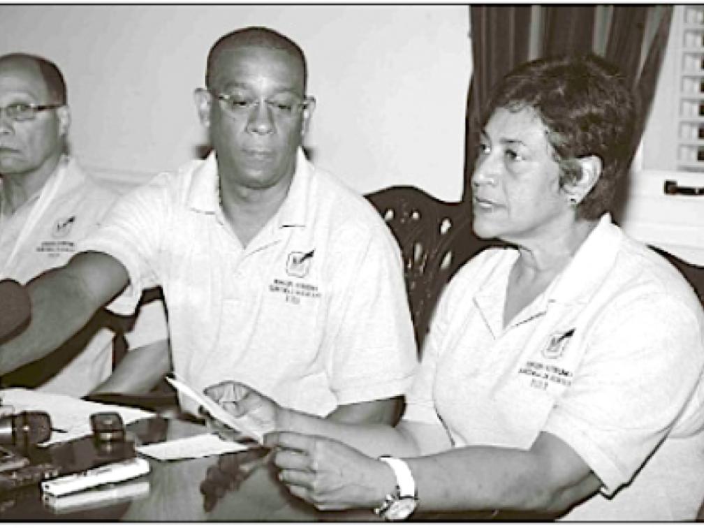 Vicevoorzitter van het Hoofdstembureau Lisa Dindial leest de uitslagen van de voorverkiezingen voor. Naast haar zit voorzitter Geomaly Martes en lid van het Hoofdstembureau Charles Do Rego | Foto Edsel Sambo