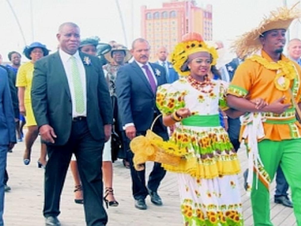 Leden van de Staten van Curaçao wandelen vanaf Punda via de Emmabrug naar Otrobanda om daar de viering van de Dia di Bandera op het Brionplein bij te wonen.