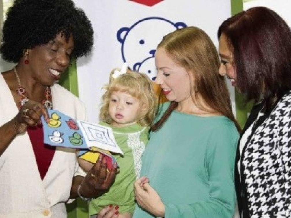 Minister Irene Dick van Onderwijs (l) vanochtend bij de opening van het hoekje voor jonge kinderen. In het bijzijn van TeleCuraçao-nieuwslezeres Nicole Maduro (m) en bibliotheekdirecteur Gerda Willems (r).