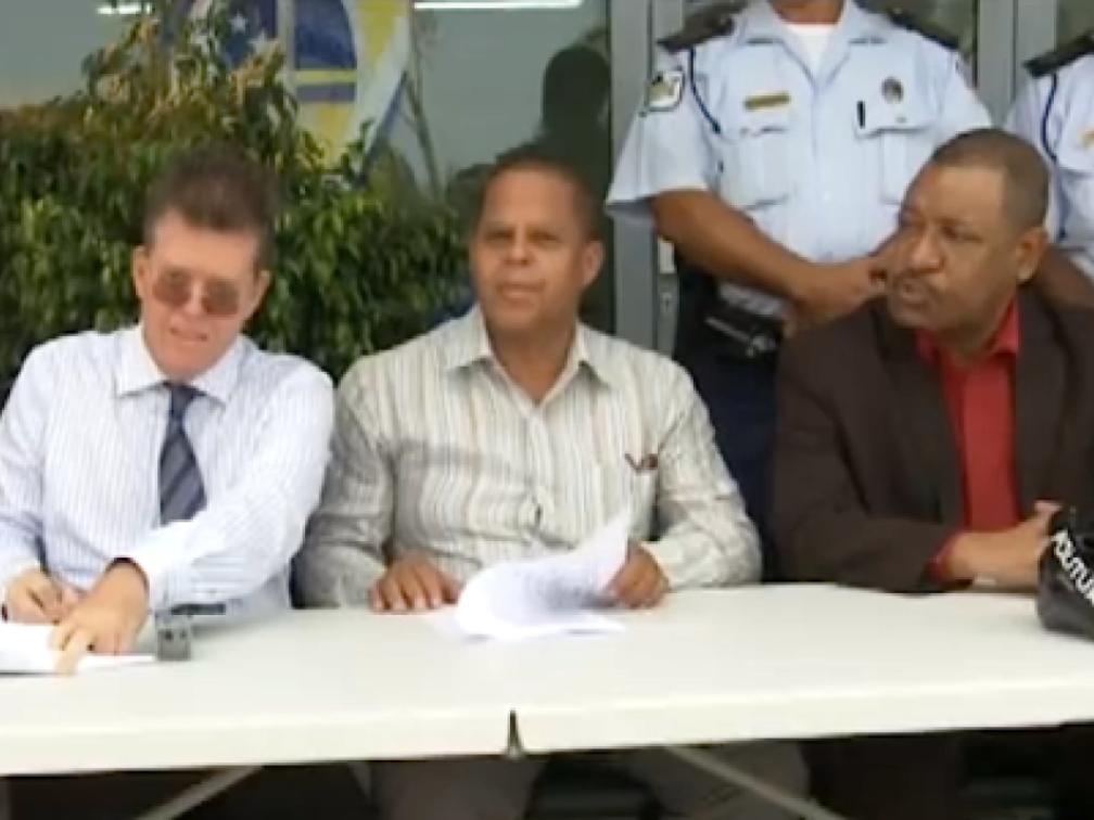 CAH-Direkteur Maurice Adriaens (links), Minister Navarro (rechts) en zijn voormalig medewerker Humprey Josefa (midden) ondertekenen het contract voor Politur