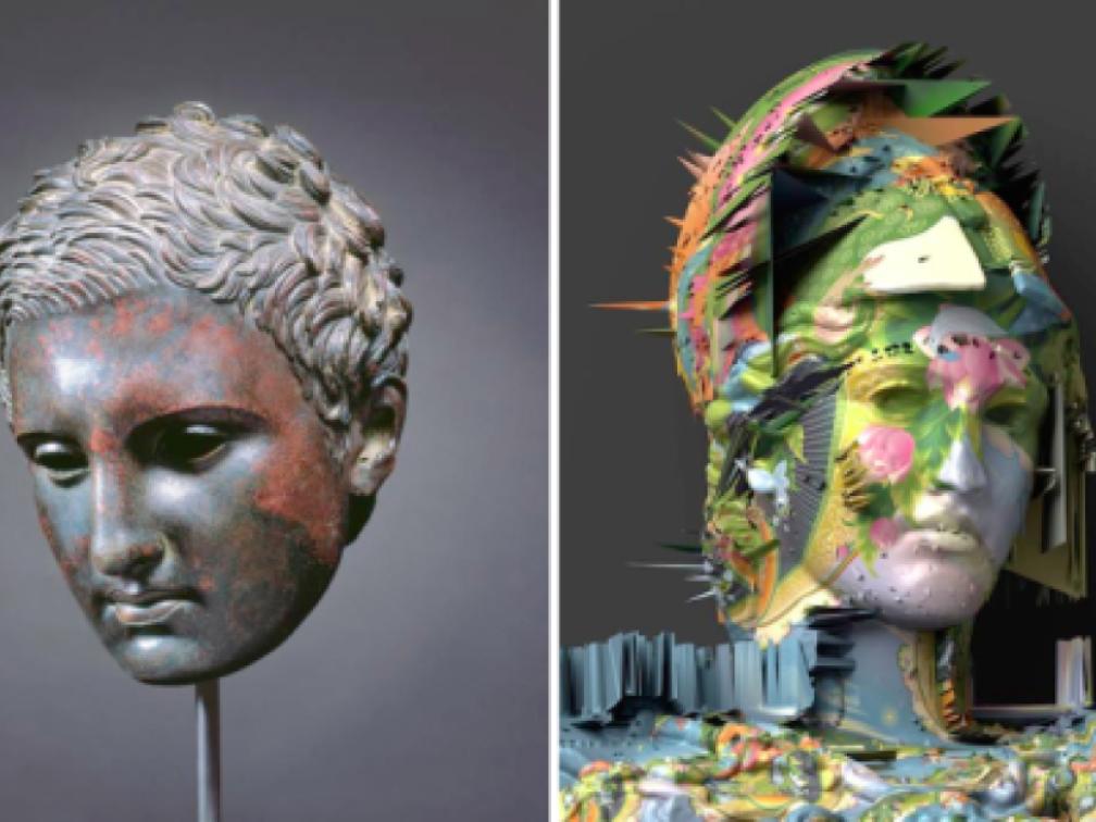 Bronzen hoofd van een atleet, de zogenaamde Apoxyomenos of ‘schraper’ uit de periode 200-1 v.Chr. Rechts Athena | Column Renée van Aller en John de Vries