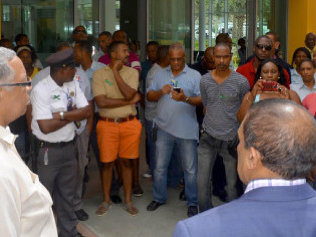 Minister Stanley Palm (midden) belooft te luisteren naar de stakers | foto: Dick Drayer