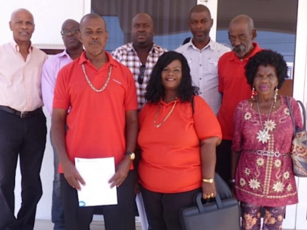 Op de achterste rij, vlnr. Lucien Larmonie van Fekoskan, Raymon Gericho van GMN, Herbert Henrietta, voorzitter Koplacan Reny Pinedo, penningmeester Emilio de Windt; op de voorste rij, vlnr. Ellis Ercicia, Jarmine Ercicia-Angela en getuige Lorine Simmons.