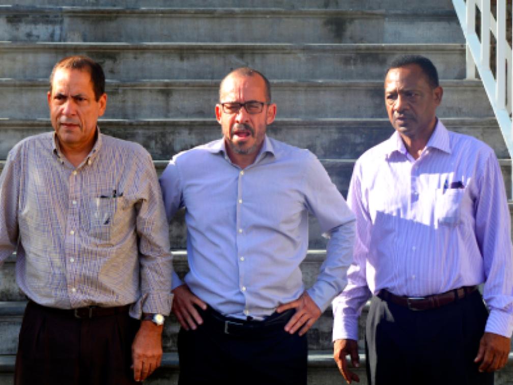 Berisping voor Eldon 'Peppie' Sulvaran (midden) voor uitlatingen over Tromp | Persbureau Curacao