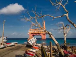 Het olieplatform CIMC Gretha heeft ruim een jaar in het haventje van Boka Samí gelegen. Ontkomt het zo een rechtsgang? © Patrick Geers