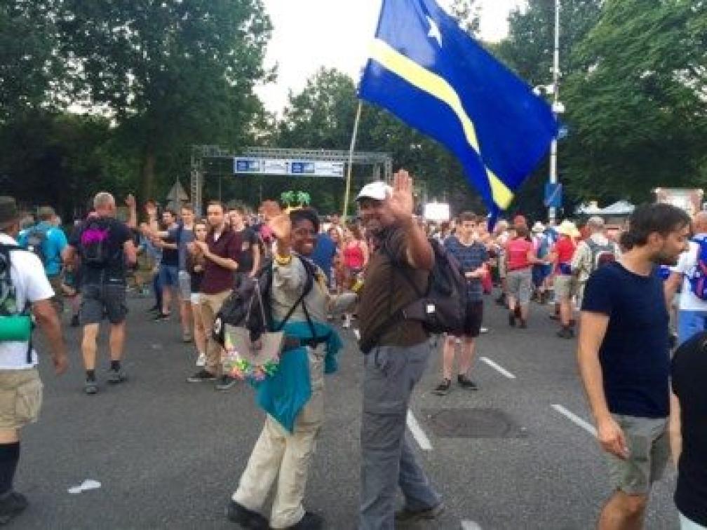 Waarom al die lelijke taal en oordelen over en weer? Het lijkt mij dat iedereen vrij is om mee te doen wanneer hij/zij wil en ook om al of niet een vlag te dragen. Mijn partner (voorheen meerdere keren meegedaan vanuit de Antilliaanse militie) en ik hebben dit keer als burger-deelnemer met trots de Curaçaose vlag gedragen, net zoals de Vietnamees, de Bonariaan, de groep Japanners, de Israëliërs, en nog wat mensen uit andere landen die we onderweg tegenkwamen. Het leidt tot nadere kennismaking en leuke gesprekken onderweg!