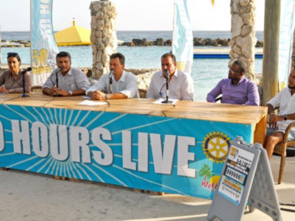Op 5, 6 en 7 juni wordt de derde editie van ’50 Hours Live’ gehouden. Gisteren werden op het strand van Wet ‘n Wild de activiteiten bekendgemaakt. Verschillende radiostations zullen ook dit jaar weer 50 uur live uitzenden vanaf het strand om geld in te zamelen voor schoolspullen voor kansarme kinderen. Volgens de organisatoren is dat helaas nog steeds nodig. Zanger Levi Silvanie (rechts) lichtte zijn speciale programma voor kinderen toe. Verder treden lokale en internationale artiesten op en keert ook het populaire paalzitten weer terug.