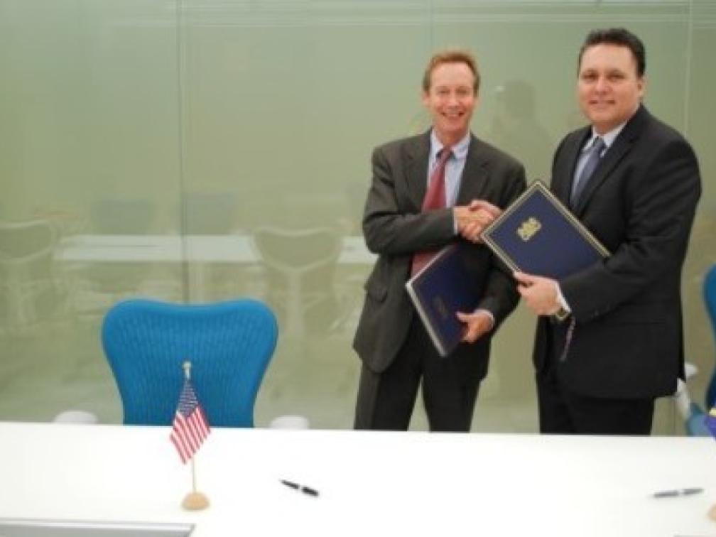 Consul-generaal James Moore (links) en minister José Jardim van Financiën schudden elkaar de hand na de overeenkomst te hebben getekend om de ‘Foreign Account Tax Compliance Act’ (Fatca) te implementeren. | FOTO AMERIKAANS CONSULAAT