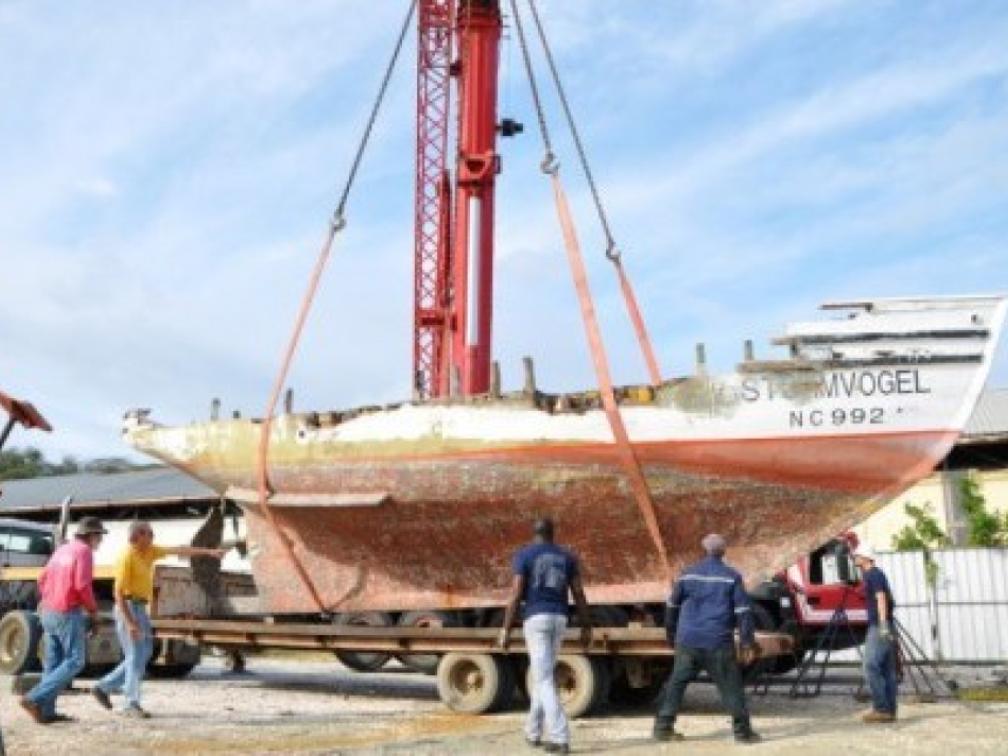 De Stormvogel, een 14 meter lange houten schoener, is woensdag op een dieplader getakeld voor verscheping naar Bonaire waar het schip in 1936 werd gebouwd. | Foto Els Kroon