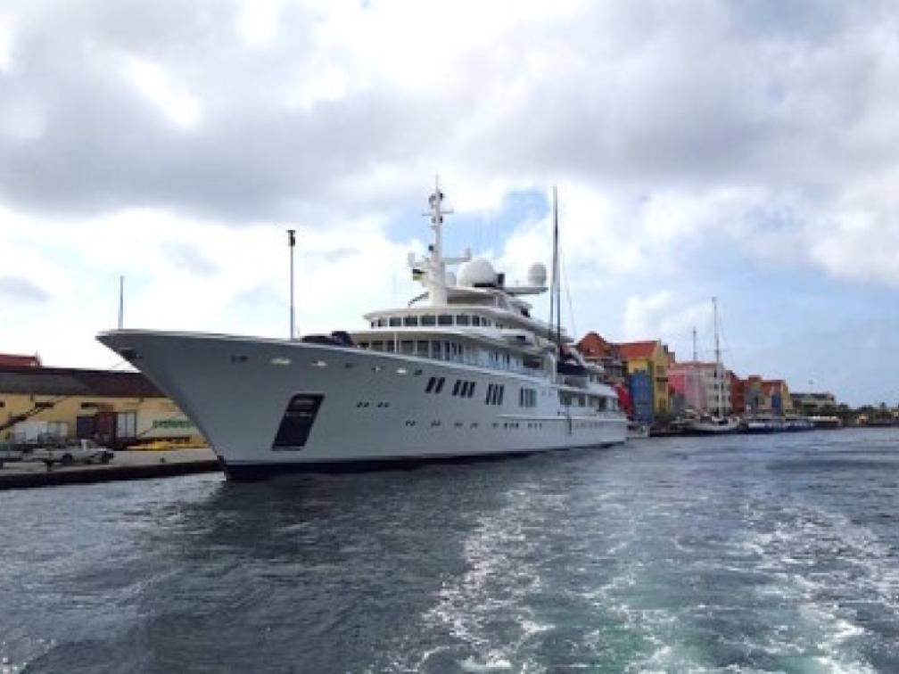 Willemstad - Het superjacht Tatoosh is aangemeerd. Gisteren legde de boot aan bij de Kleine Werf. Met een lengte van 92,40 meter en vijf verdiepingen staat het op de 43e plek van grootste superjachten ter wereld.