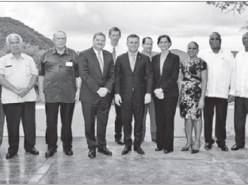 Premier Mike Eman (Aruba), premier Gerrit Schotte (Curaçao) en premier Sarah Wescot-Williams (Sint Maarten), omringd door de twaalf commissieleden die gezamenlijk de juridische en strategische commissies vormen. FOTO RAMSAY SOEMANTA
