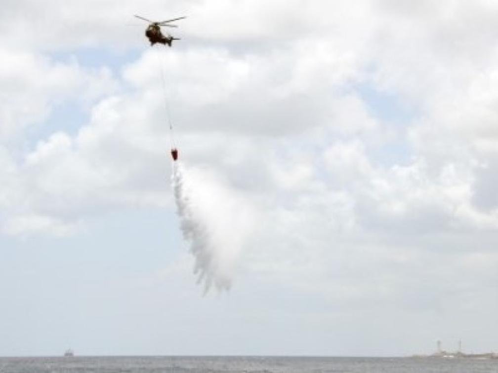 Tientallen badgasten op het Sea Aquarium strand konden gisteren genieten van een extra attractie. De momenteel op het eiland gestationeerde Cougar-transporthelikopter van het Nederlandse ministerie van Defensie voerde voor hun neus tot vijf keer toe een spectaculaire oefening uit met de zogenaamde Bambi Bucket, een grote zak die onder de helikopter hangt en die gevuld werd met zeewater.