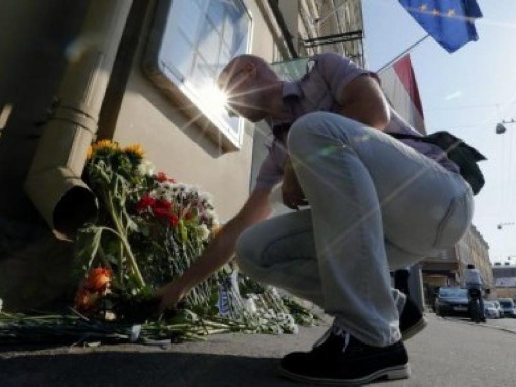 Mensen leggen bloemen voor Nederlands consulaat in St. Petersburg, Rusland