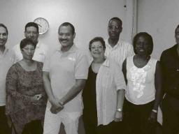 Statenlid Mike Franco (links) met naast hem zijn fractiegenoten Alex Rosaria en Marilyn Moses van Pais voor zijn verkiezing als Statenvoorzitter.