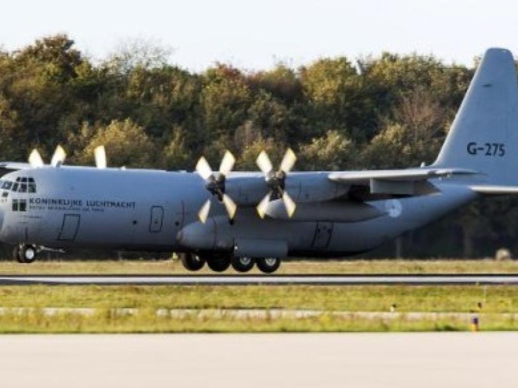 Op Vliegbasis Eindhoven is zaterdagmiddag een Hercules-transportvliegtuig van de Nederlandse luchtmacht geland met aan boord vijf kisten met stoffelijke resten van slachtoffers van de vliegramp met MH17.