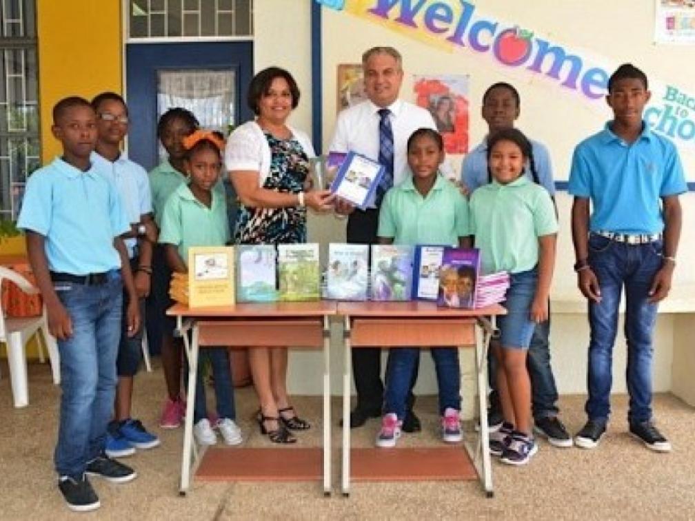 Banco di Caribe (BdC) en Fundashon Editorial Sembra Buki overhandigden op 17 september een stapel leesboeken aan de Angela Jessurun basisschool.