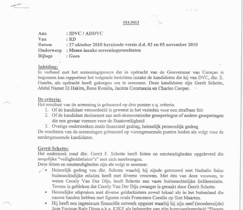 Dindial schrijft een brief aan Schotte dat de screening van kandidaat ministers plaats vindt op basis van een questionnaire door de ministers in te vullen en niet op basis van een staat van inlichtingen. Maar ik hoor dat in werkelijkheid de screening plaatsvindt op basis van inlichtingen verzameld door de veiligheidsdienst en niet alleen op basis van een door de betrokken kandidaten zelf in te vullen questionnaire.