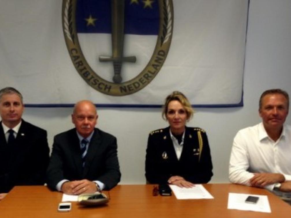 Gezaghebber Jonathan Johnson, hoofdofficier Henry Hambeukers, korpschef Hildegard Buitink en hoofdinspecteur Eric Willems | foto: Hazel Durand