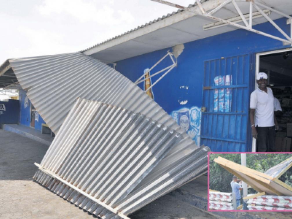 Het volledige dak van een container aan de Seru Loraweg belandde gistermiddag ook op de grond. Ook vandaag zal het flink waaien. Op zee zullen de golven 2 tot 3 meter hoog zijn.