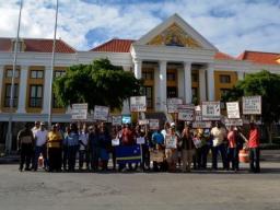 WILLEMSTAD - Ruim 40 demonstranten zorgden gisteren voor een grimmige sfeer op het Wilhelminaplein. Ze waren daar om advocaat Sulvaran en zijn collega’s te ondersteunen.