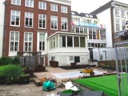 Curaçaohuis zich bij de aanleg van een tuin heeft gehouden aan de afspraken. Het plantsoentje - voorzien van onder meer een terras met tafel en stoelen, een kunstgrasveldje en een artistiek vormgegeven fontein - beslaat ongeveer de helft van het oorspronkelijke, op eigen terrein gelegen parkeerterrein.