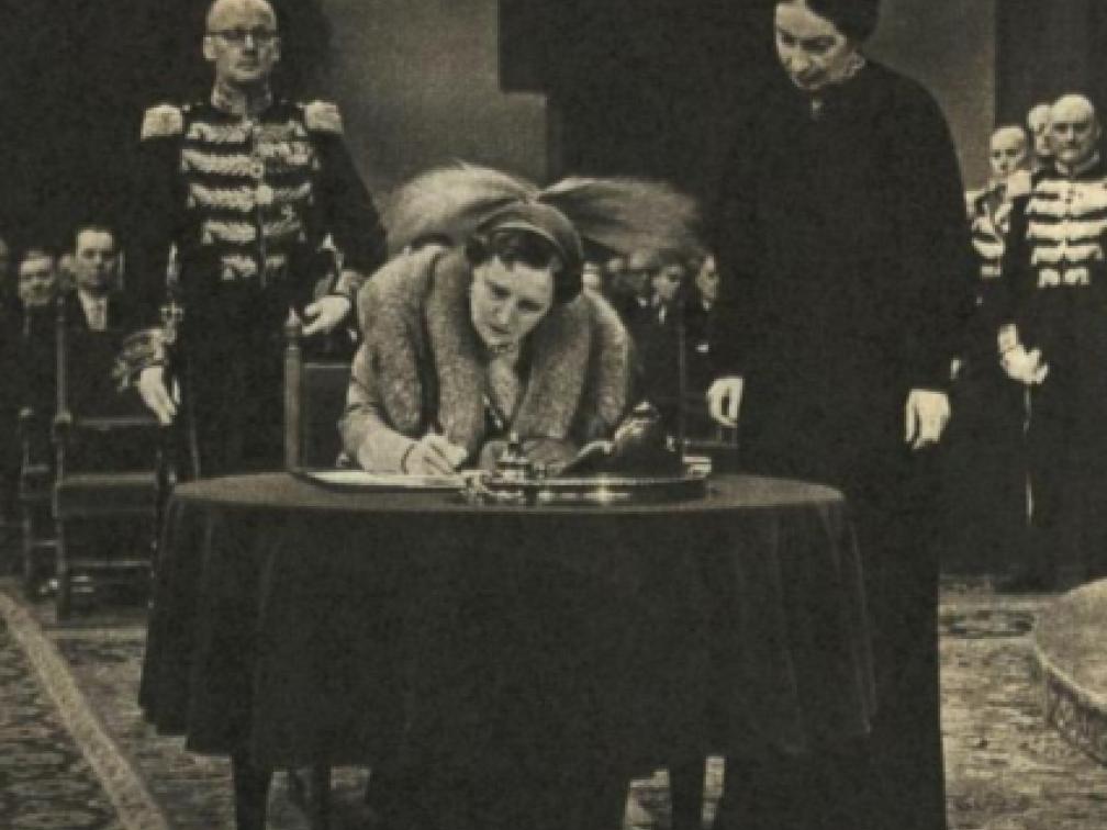 Koningin Juliana tekent het Statuut voor het Koninkrijk der Nederlanden in 1954. Foto: Historische database Delpher