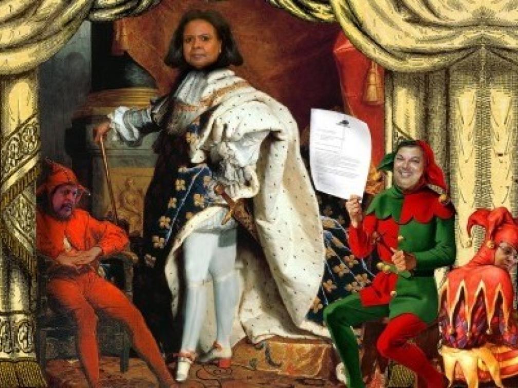 En ook nog eens tonnen uitgeeft om haar in het zadel te houden (het sprekende mantelpak Stella van Rijn wordt benoemd tot kindermeisje, de bange bejaarde Begina tot kinderoppas en een leger consultants vult zijn zakken met het schrijven van rapporten die herhaling op herhaling zijn en door de Staten niet eens gelezen worden).