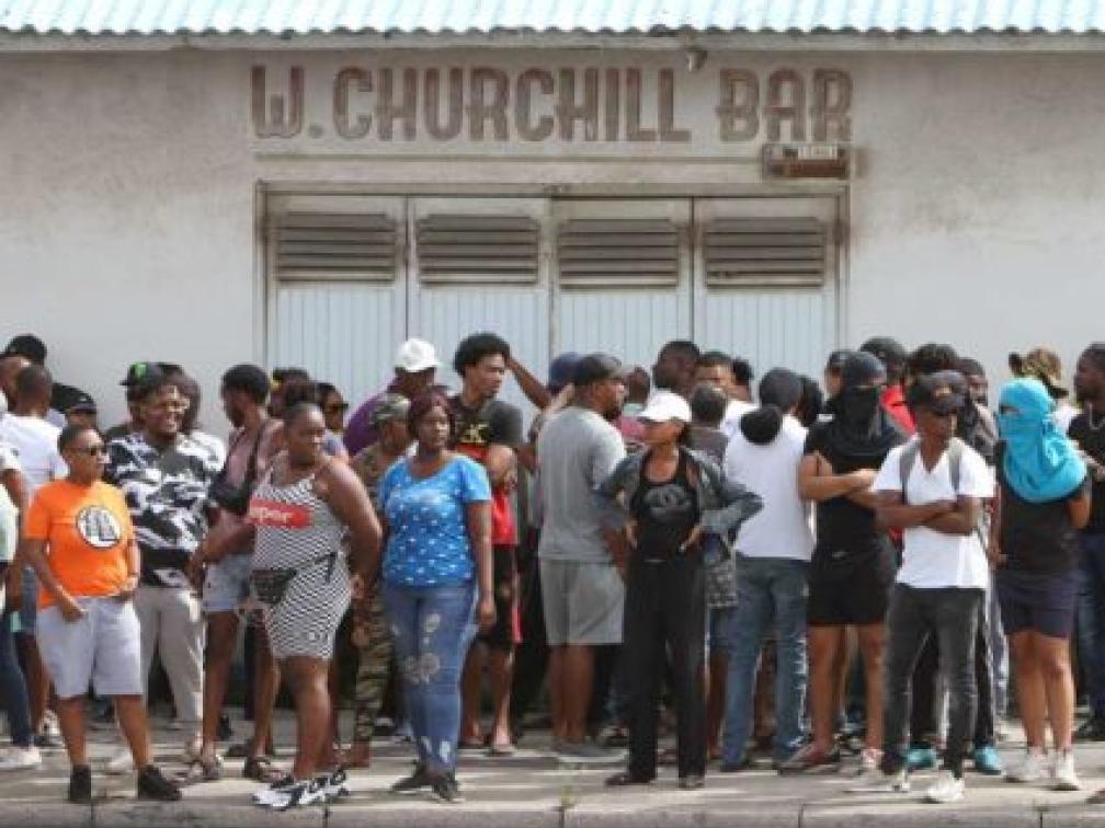 © ANP — Op Curaçao is veel onvrede over de huidige economische situatie. Deze groep demonstranten staat bij het politiebureau in Willemstad waar een van de actievoerders wordt vastgehouden. Demonstranten eisen het aftreden van minister-president Eugene Rhuggenaath | ANP