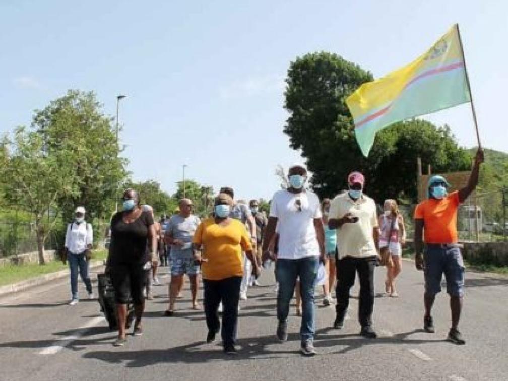 Noch Feucher, noch president van de Collectivité Daniel Gibbs waren bij het protest aanwezig om oplossingen aan te dragen. Na de ontmoeting tegenover Home N Tools marcheerden de demonstranten onder de Unity Flag naar het gendarme-controlepunt, ongeveer halverwege de Cole Bay-grens, waar een aantal mensen het woord nam.