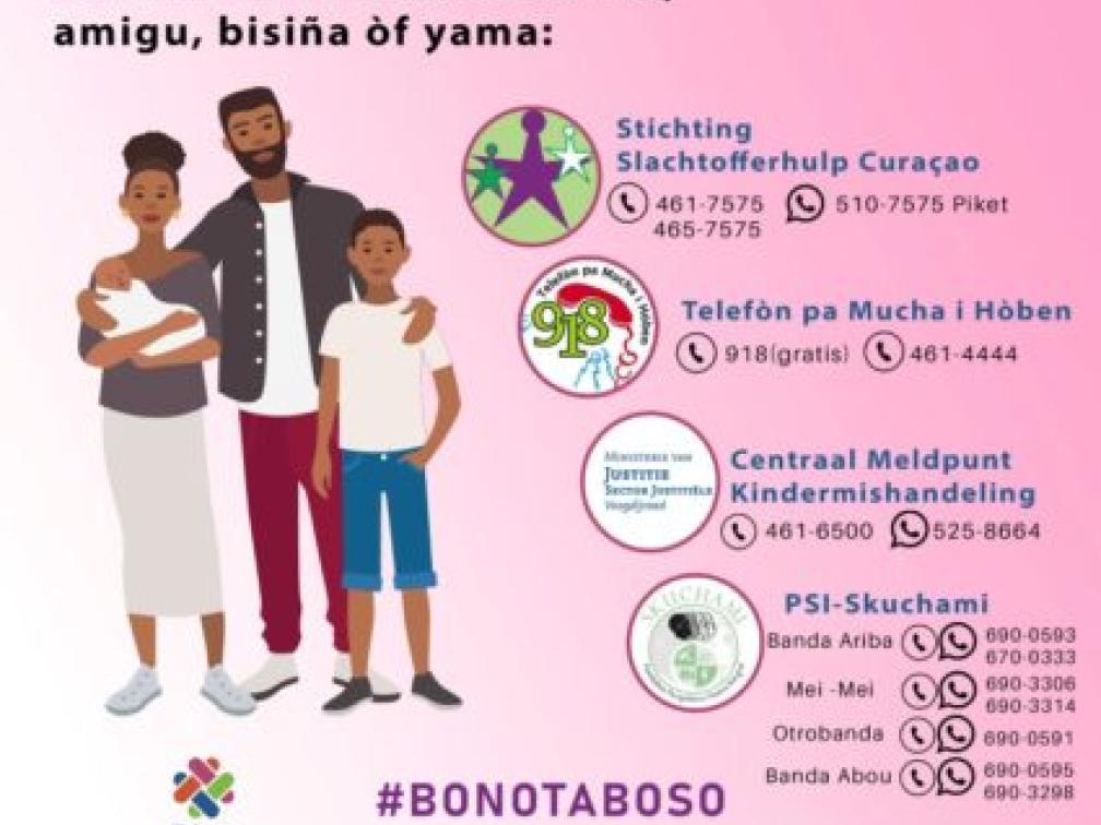,,Er zijn verschillende gouvernementele en niet-gouvernementele instanties die zich inzetten tegen misbruik. Het is ons echter nog niet gelukt dit te elimineren. In ons streven om dit wel te doen en de gevallen die er zijn goed aan te pakken, zijn we de samenwerking aangegaan met onder andere Amnesty International, PSI-Skuchami, Bos di Hubentut, Stichting Slachtofferhulp Curaçao, Voogdijraad/CMK, Aliansa, Veiligheidshuis/AJJC, de kindertelefoon, Cafra, Seda, Famia Plania en het Openbaar Ministerie om bewustzijn te creëren en bewoners van Curaçao te informeren over de instanties waar ze terechtkunnen en stappen die ze kunnen nemen om hulp te zoeken voor zichzelf, een familielid of kennis die het slachtoffer is van misbruik”, aldus minister Hensley Koeiman (MAN) van SOAW.