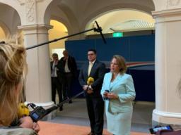 Silveria Jacobs, premier van Sint Maarten, en Eugene Rhuggenaath, premier van Curaçao, vrijdag na afloop van de rijksministerraad in Den Haag | Freek van den Bergh / de Volkskrant