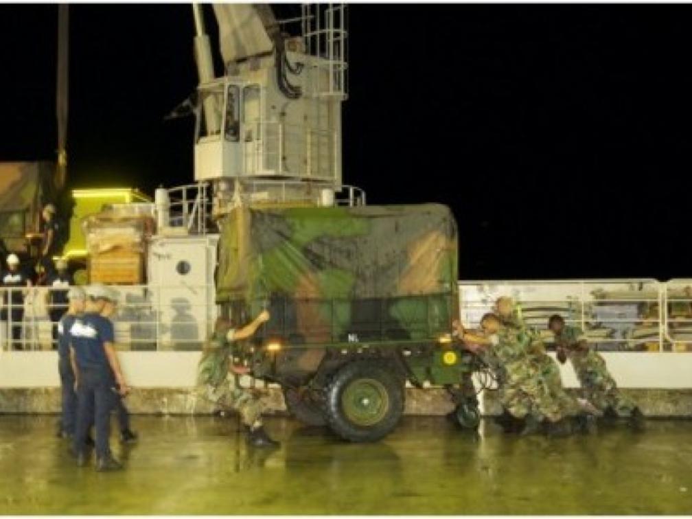 Nog voor het ontladen was voltooid gingen de eerste teams al op weg. Water en medicijnen zijn het hardste nodig. Daarnaast moet er gewerkt worden aan de beschadigde infrastructuur. De militairen vertrekken dan ook als eerste naar het vliegveld aan de noordzijde van het eiland om dat vrij te maken voor vliegtuigen met hulpgoederen.