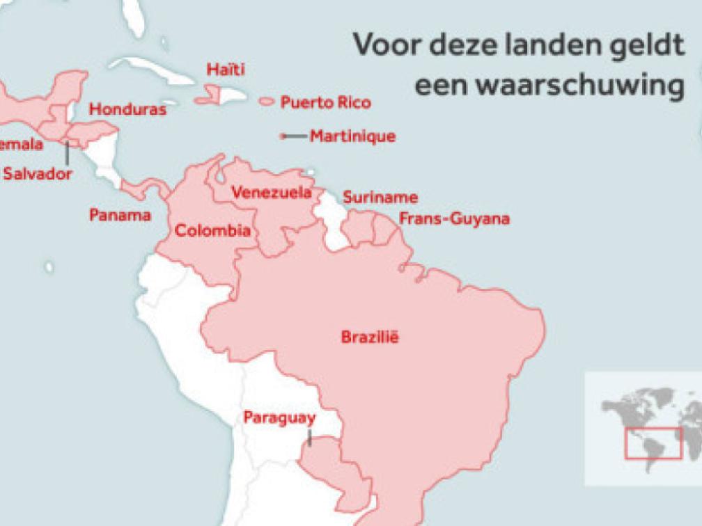 De waarschuwing geldt voor Brazilië, Colombia, El Salvador, Frans-Guyana, Guatemala, Haïti, Honduras, Martinique, Mexico, Panama, Paraguay, Puerto Rico, Suriname en Venezuela.