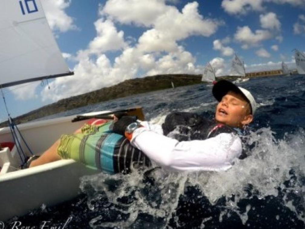Het was een waar internationaal waterspektakel afgelopen weekend in de Caracasbaai. Bij een harde wind scheerden veertig jeugdzeilers uit binnen- en buitenland over het Curaçaose water. Vooral de delen van de koers buiten de baai, op de volle zee, vormden een flinke uitdaging. In totaal werden er twaalf races verspreid over het drie wedstrijddagen gevaren. Op de foto Bas van der Gulik in actie.