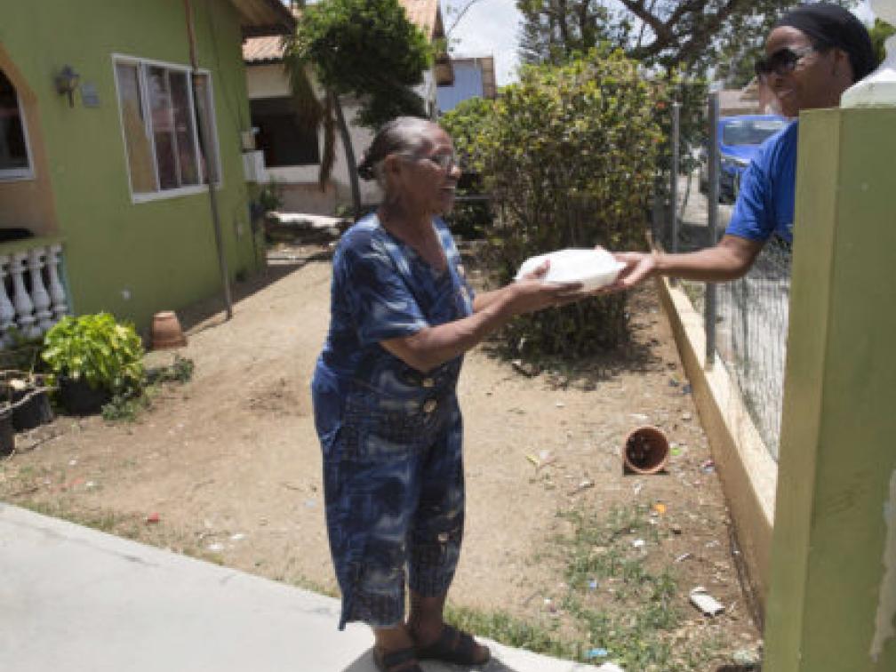 Het Rode Kruis verzorgt samen met Stichting Help Curaçao warme maaltijden voor mensen die getroffen zijn door de coronacrisis op het eiland. Veel eilandbewoners verloren hun baan toen het eiland in maart in lockdown ging.Beeld ANP