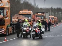 DE LUTTE - Het konvooi met wrakstukken van MH17 is op weg naar vliegbasis Gilze-Rijen. De acht vrachtwagens vertrokken dinsdagmorgen om 10.15 uur van een parkeerplaats bij grensovergang Bad Bentheim/De Lutte. Een aantal motoragenten begeleidt de wagens.